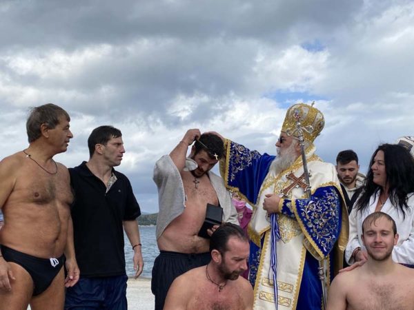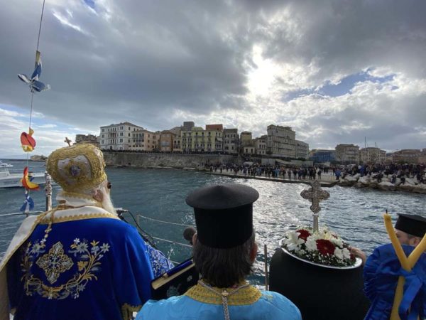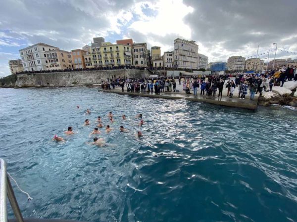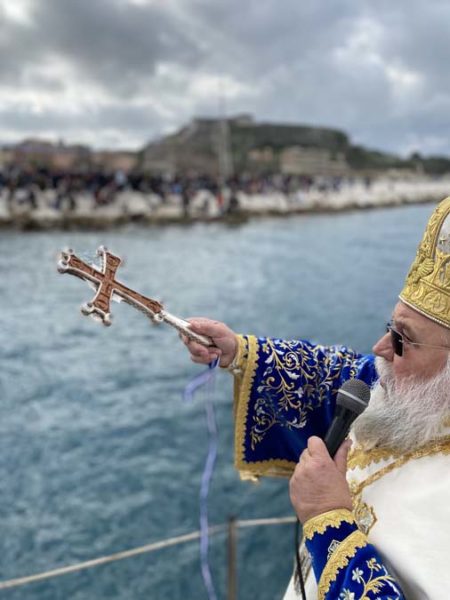Στην συνέχεια, έγινε στο παλιό λιμάνι της Κέρκυρας η κατάδυση του τιμίου Σταυρού και ο αγιασμός των υδάτων, με την παρουσία των αρχών του νησιού. Τολμηροί κολυμβητές έπεσαν στη θάλασσα για να πιάσουν τον σταυρό, τον οποίο βρήκε ο Τζουλιάνο Μέρκο, ορθόδοξος από το Μπεράτι της Αλβανίας, στον οποίο ο Μητροπολίτης κ. Νεκτάριος προσέφερε έναν μικρό σταυρό ως ευλογία.