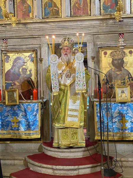 Κατά την Θεία Λειτουργία, ο Σεβασμιώτατος έλαβε αφορμή από το Ευαγγελικό ανάγνωσμα του Πλουσίου Νομικού της Παραβολής και αφού δι’ ολίγων αναφέρθηκε στο γεγονός, και στον διάλογο ο οποίος ανεπτύχθη μεταξύ του Κυρίου μας Ιησού Χριστού και του νέου Νομικού, ο οποίος είχε μεταφυσικές ανησυχίες περί της ζωής της αιωνιότητος, ο Κύριος μας με δύο λέξεις απευθύνθηκε σε εκείνον «Δεύρο ακολούθει μοι». Εάν θέλεις να γίνεις μέτοχος της Βασιλείας των Ουρανών πρέπει να αποδεσμευτείς από τα επίγεια και τα εγκόσμια και εμπρός να με ακολουθήσεις. Ο Κύριος μας χωρίς περιστροφές, με τον ίδιο τρόπο απλά και σύντομα, απευθύνθηκε και στους πρώτους μαθητές Του πλησίον της λίμνης Γεννησαρέτ.