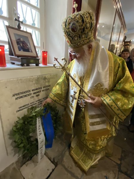 Στο τέλος της Θείας Λειτουργίας ο Σεβασμιώτατος μετά του εκλεκτού εφημερίου και ρέκτου της ενορίας, πρωτοπρεσβυτέρου π. Αθανασίου Κοκκινόπουλου, τέλεσε μνημόσυνο υπερ αναπαύσεως της ψυχής του αοιδίμου Αρχιεπισκόπου Σλαβινίου και Χερσώνος, και αργότερον Αστραχάν, Νικηφόρου Θεοτόκη.