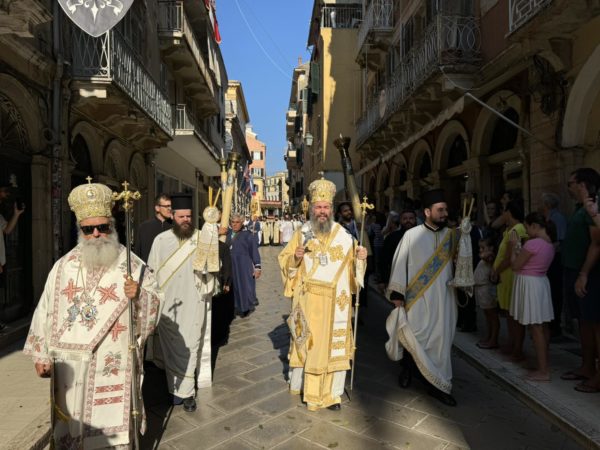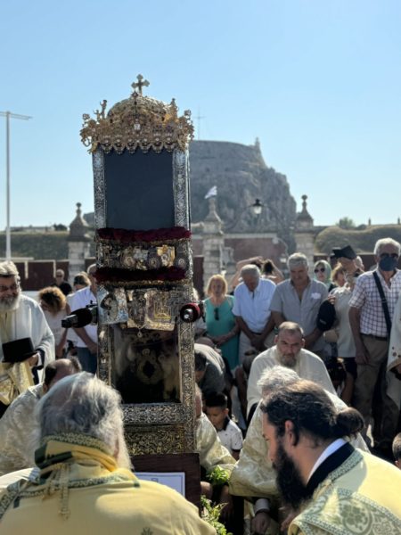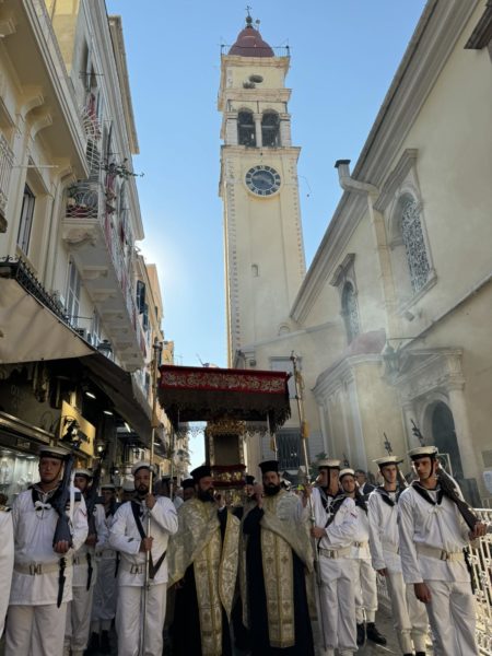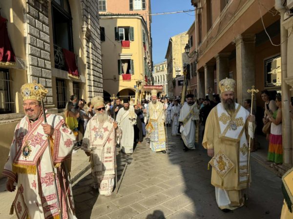 Η λιτανεία του ιερού σκηνώματος του Αγίου Σπυρίδωνος έκανε πλήθος κόσμου να συσσωρευθεί και να συμπροσευχηθεί. Στην λιτανεία συμμετείχαν οι Σεβασμιώτατοι Μητροπολίτες Ύδρας, Σπετσών και Αιγίνης κ. Εφραίμ, Θεσσαλονίκης κ. Φιλόθεος, ο Θεοφιλέστατος Επίσκοπος Κοτυαίου κ. Διονύσιος, βοηθός του Μητροπολίτη Ιταλίας, και ο οικείος Ποιμενάρχης, Σεβασμιώτατος Μητροπολίτης Κερκύρας, Παξών και Διαποντίων Νήσων κ. Νεκτάριος.