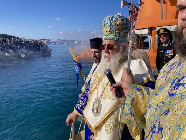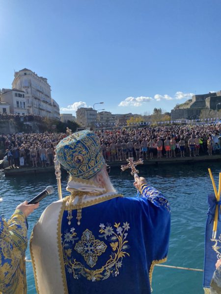 Ο Σεβασμιώτατος πάνω από το λιμενικό σκάφος, και έχοντας την θεωρία των ανθρώπων επί της ξηράς, με κατάλληλα διαμορφωμένο μικροφωνικό εξοπλισμό, τον οποίο επιμελήθηκε ο Δήμος Κέρκυρας, απηύθυνε μήνυμα στο πλήθος των ανθρώπων, λέγοντας τους ότι σήμερα «λαμπαδοφεγγεί πάσα η κτίσις, η οποία καθαίρεται εν τω Ιορδάνη ποταμώ», λόγια του μεγαλοφωνοτάτου των προφητών Ησαΐου, τα οποία ελέχθησαν 800 χρόνια πριν το γεγονός της Βαπτίσεως του Κυρίου μας, και είναι διαχρονικά επίκαιρα και στις μέρες μας.
