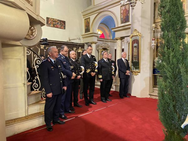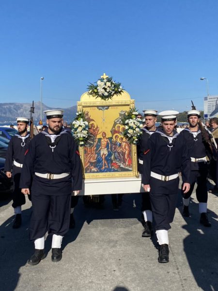 Ακολούθως, σχηματίστηκε λιτανευτική πομπή με φιλαρμονική και αγήματα στρατιωτικά, αλλά και με τοπικές ενδυμασίες, και κατευθύνθηκε στο παλιό λιμάνι όπου επέβησαν σε ειδικό σκάφος του λιμενικού, ο Σεβασμιώτατος και οι αρχές του τόπου.