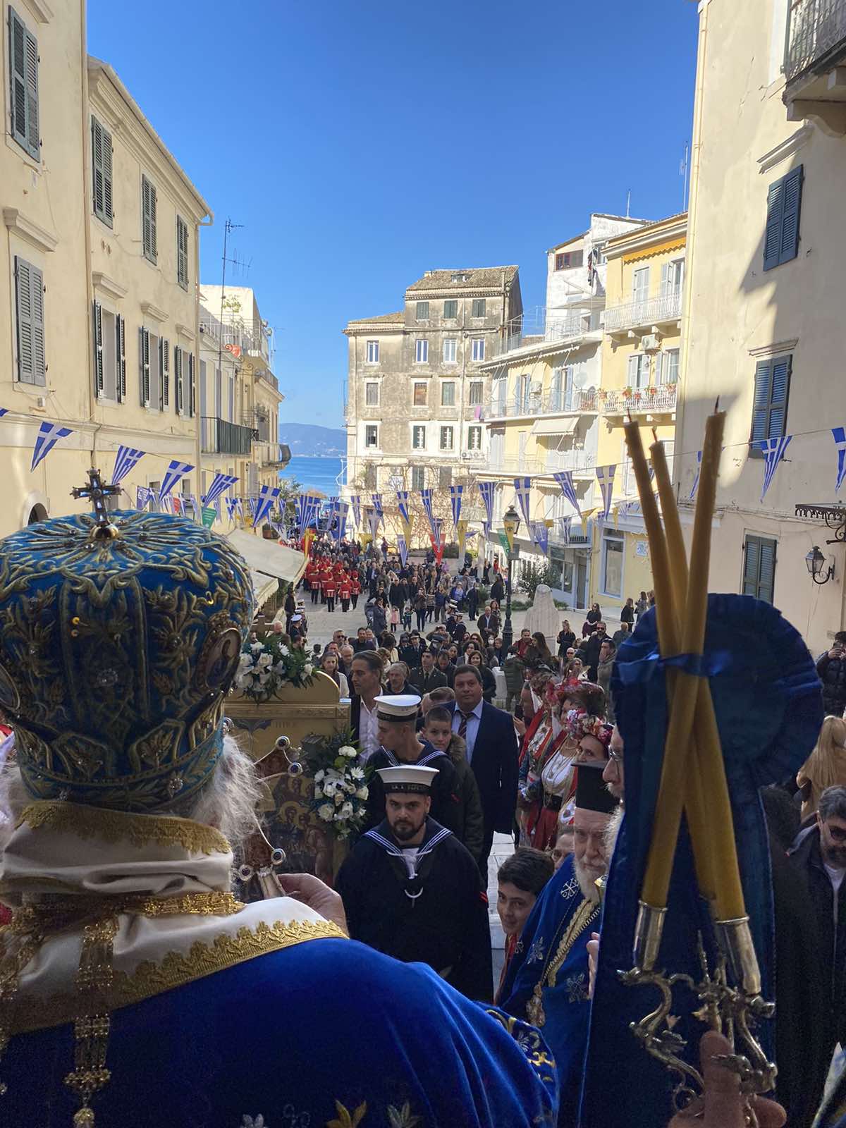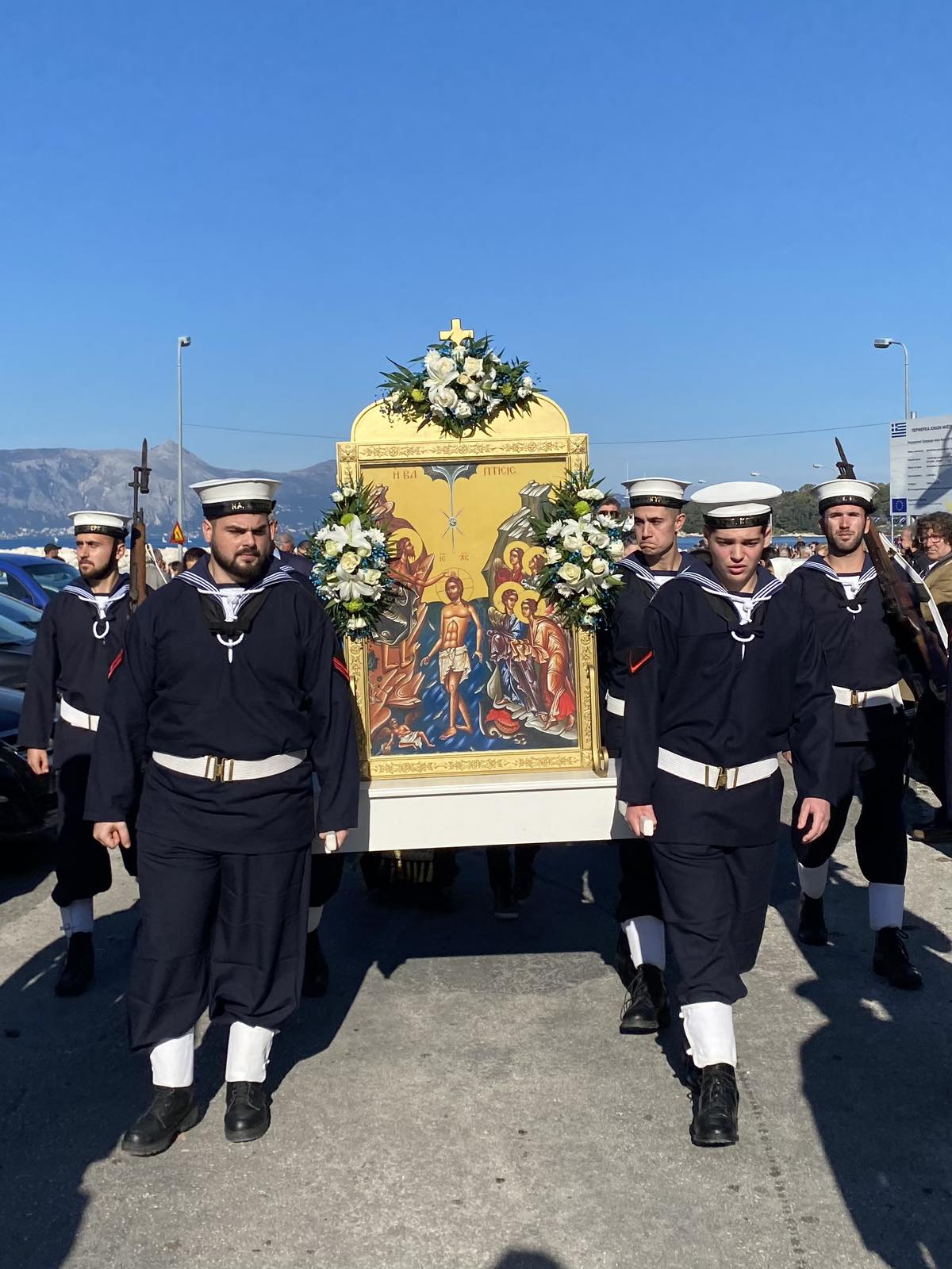 Ακολούθως, σχηματίστηκε λιτανευτική πομπή με φιλαρμονική και αγήματα στρατιωτικά, αλλά και με τοπικές ενδυμασίες, και κατευθύνθηκε στο παλιό λιμάνι όπου επέβησαν σε ειδικό σκάφος του λιμενικού, ο Σεβασμιώτατος και οι αρχές του τόπου.