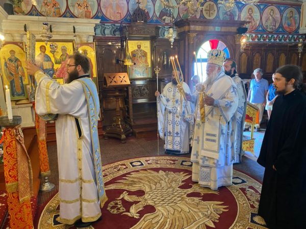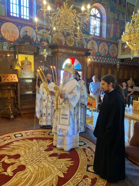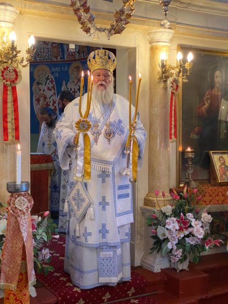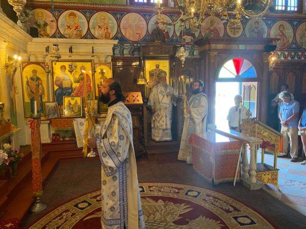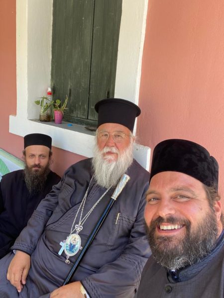 Κατά την Θεία Λειτουργία, η οποία τελέστηκε στη σκάλα των Οθωνών, στον Ιερό Ναό της Αγίας Τριάδος, συλλειτούργησε μετά του Αρχιμανδρίτου π. Ιωσήφ Σαμπάνωφ, και των διακόνων του, τον αρχιδιάκονο π. Χριστόδουλο Τριαντάφυλλο και τον δευτερεύοντα π. Ανδρέα Γκιόκα. Ο Σεβασμιώτατος στην προσπάθεια του να έχει μονίμους ιερείς και στα τρία Διαπόντια νησιά, στους Οθωνούς δημιούργησε ένα μικρό ησυχαστήριο προκειμένου να μπορεί μια μικρή μοναστική αδελφότητα αφενός να απολαμβάνει της ησυχίας που προσφέρει η νήσος, και αφετέρου να υπάρχει η δυνατότητα της επικοινωνίας των λιγοστών κατοίκων με την εκκλησία.