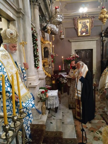 Στο συλλείτουργο προεξήρχε ο Σεβασμιώτατος Μητροπολίτης Καλαβρύτων και Αιγιαλείας κ. Ιερώνυμος, ενώ συλλειτούργησαν ο Σεβασμιώτατος Μητροπολίτης Ζιχνών και Νευροκοπίου κ. Ιερόθεος και ο οικείος Ποιμενάρχης Μητροπολίτης Κερκύρας, Παξών και Διαποντίων Νήσων κ. Νεκτάριος.