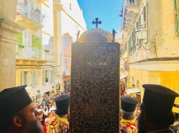 Πραγματοποιήθηκαν, το απόγευμα της Τρίτης 30 Απριλίου 2019, τα Μπάσματα του Ιερού Σκηνώματος του Αγίου Σπυρίδωνος (η επανατοποθέτηση, δηλαδή, του Ιερού Λειψάνου, εντός της λάρνακας που φυλάσσεται).