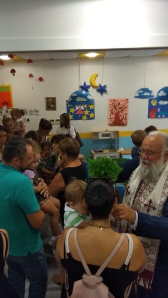 Με χαρά και συγκίνηση ο κ. Νεκτάριος έγινε ένα με τα μικρά παιδιά και απευθυνόμενος στους γονείς που συμμετείχαν στον αγιασμό τόνισε ότι τα παιδιά μεγαλώνουν με πνευματική ασφάλεια στην Εκκλησία! Σε μία εποχή στην οποία υπάρχει σύγχυση και που οι αξίες της πίστεως και της πατρίδος αντιμετωπίζονται με προκατάληψη το να στέλνουν οι γονείς τα παιδιά τους στον βρεφονηπιακό σταθμό της Εκκλησίας είναι πράξη αντίστασης, ελπίδας και αγάπης που αγκαλιάζει την σύνολη ανάπτυξη της προσωπικότητας του παιδιού, σύμφωνα με τις αρχές της παραδόσεώς μας. Επεσήμανε τη ζεστασιά και το φιλόξενο των εγκαταστάσεων της τοπικής Εκκλησίας, το γεγονός ότι τόσο η διευθύντρια κ. Άννα Κοντοπούλου, όσο και το παιδαγωγικό προσωπικό καταβάλλουν κάθε δυνατή προσπάθεια ώστε τα παιδιά να κοινωνικοποιηθούν με αρτιότητα, αλλά και να μάθουν τα απαραίτητα, ενώ εξέφρασε την χαρά του για τα αγγελικά πρόσωπά τους που βρίσκουν ανάπαυση στην φωλιά της Εκκλησίας.