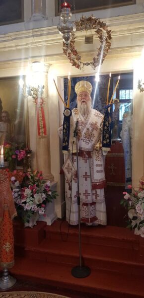 Ο κ. Νεκτάριος, μιλώντας προς τους πιστούς, τόνισε ότι επισκέφθηκε το νησί και λειτούργησε για τους ακρίτες κατοίκους που φυλάττουν τα σύνορα της πατρίδας μας με ηρωισμό αλλά και με μαρτυρία φιλοπάτριδων μη εγκαταλείποντας της πατρογονικές εστίες τους. Στο κήρυγμά του κατά την θεία λειτουργία αφορμήθηκε από το Ευαγγελικό ανάγνωσμα, στο οποίο ένας νέος θέλησε να διεκδικήσει την βασιλεία των ουρανών με εντελώς εξωτερικά και επιφανειακά κριτήρια και όχι την πεμπτουσία της αφιέρωσης που ζητά ο Κύριός μας απο τον καθέναν μας προκειμένου να ειμαστε μέτοχοι της δωρεάς του Θεού. Έκρινε τον εαυτό του και απεχώρησε, εμμένοντας στην βόλεψή του την επίγεια και πρόσκαιρη.