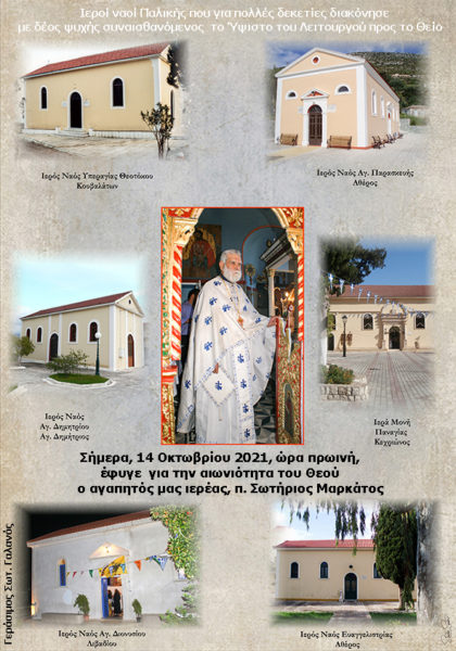 Εκοιμήθη σήμερα, 14 Οκτωβρίου 2021, ο π. Σωτήριος Μαρκάτος, που διακόνησε πολλούς από τους ιερούς ναούς και τα παρεκκλήσια της Παλικής χερσονήσου, που καλύπτει τη δυτική πλευρά της Κεφαλλονιάς.