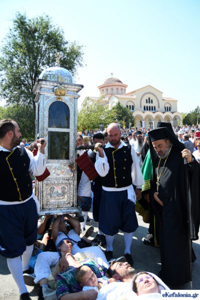 Ακολούθησε λιτάνευση του σκηνώματος του Αγίου μας, περνώντας πάνω από πλήθος πιστών που καθήμενοι στο έδαφος σχημάτισαν και σήμερα μία ανθρώπινη αλυσίδα, επιζητώντας τη βοήθεια του Αγίου. Και φέτος η ιερά Λιτάνευση έφτασε μέχρι τον πλάτανο που ο ίδιος ο Άγιος Γεράσιμος είχε φυτέψει αλλά και το πηγάδι που είχε δημιουργήσει.
