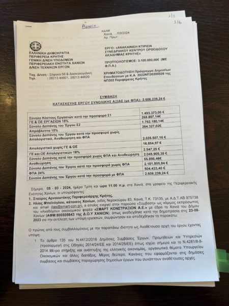 Η υπογραφή της σύμβασης πραγματοποιήθηκε, στα γραφεία της Αντιπεριφέρειας Χανίων, παρουσία του Περιφερειάρχη Κρήτης κ. Σταύρου Αρναουτάκη, του Μητροπολίτη Κισάμου και Σελίνου κ. Αμφιλοχίου, του Αντιπεριφερειάρχη Χανίων κ. Νίκου Καλογερή, του Γενικού Διευθυντή της Ορθοδόξου Ακαδημίας Κρήτης Δρ. Κωνσταντίνου Ζορμπά, των Προϊσταμένων των Τεχνικών Υπηρεσιών και Μηχανικών της Αντιπεριφέρειας Χανίων, των Μηχανικών της Ιεράς Μητρόπολης Κισάμου και Σελίνου ως και των εκπροσώπων της αναδόχου κατασκευαστικής εταιρείας Smart Constructions.
