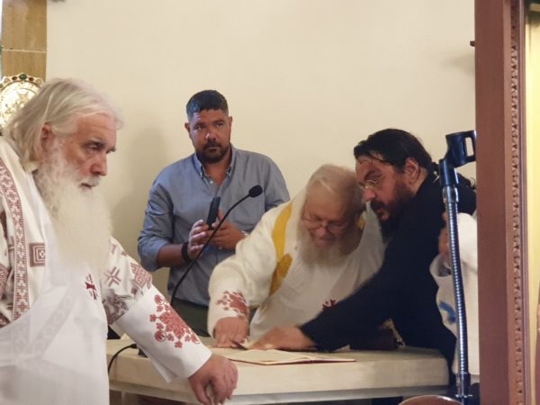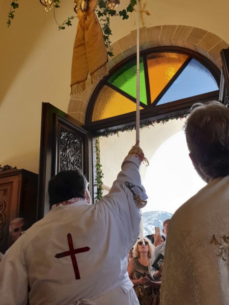 Ο Γέρων Πριγκιποννήσων κ. Δημήτριος αλλά και ο οικείος ιεράρχης ντυμένοι αμφότεροι στα λευκά, σύμβολο αγνότητας και καθαρότητας, σχημάτισαν δεξιά και αριστερά του ιερού καθώς επίσης και εντος του ναού, σε όλα τα σημεία του ορίζοντα το Χριστόγραμμα. Με ένα κομμάτι ύφασμα εμποτισμένο με κερί και αρωματικά έλαια σχημάτισαν το σύμβολο του Χριστού, σε Αυτόν, στον οποίον ανήκει πλέον ο ναός.