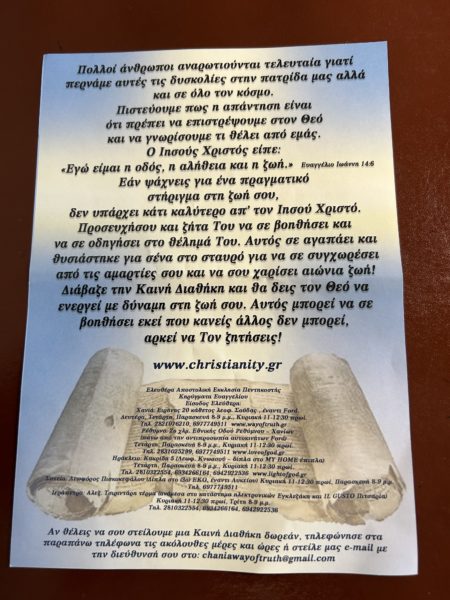Εκ της Ιεράς Μητροπόλεως Κισάμου και Σελίνου ανακοινώνονται τα εξής: Τις τελευταίες ημέρες στην Κίσαμο και την ευρύτερη περιοχή κινούνται οργανωμένα κλιμάκια – ομάδες Πεντηκοστιανών, οι οποίοι διανέμουν φυλλάδια, καλώντας όποιον επιθυμεί να επικοινωνήσει μαζί τους. Οι ομάδες αυτές ανήκουν στην λεγόμενη «Ελευθέρα Αποστολική Εκκλησία της Πεντηκοστής», η οποία ιδρύθηκε το 1965 από τον ιατρό και «ποιμένα» της συνάθροισης των Πεντηκοστιανών στην Αθήνα, Λεωνίδα Φέγγο.