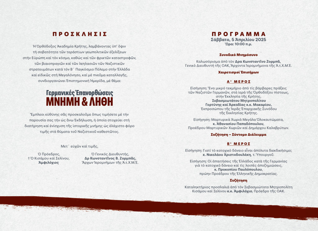 Η Επιστημονική Ημερίδα θα λάβει χώρα το Σάββατο 5 Απριλίου και ώρα 10.00π.μ., στο μεγάλο αμφιθέατρο της Ορθοδόξου Ακαδημίας Κρήτης, η οποία φέρει και την ευθύνη συντονισμού, με την τέλεση Συνοδικού Τρισαγίου, υπέρ αναπαύσεως των θυμάτων του Ναζιστικού καθεστώτος.
