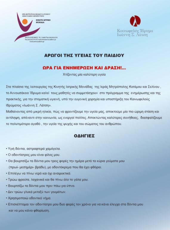Την περίοδο αυτή το Ίδρυμα Λάτση έρχεται αρωγός στην υγεία του παιδιού, καθώς στα πλαίσια λειτουργίας της Κινητής Ιατρικής Μονάδας του Αννουσάκειου Ιδρύματος της Μητροπόλεως μας, ευγενής χορηγία της Ι.Μεγίστης Μονής Βατοπαιδίου, εκατοντάδες μαθητές από την Σχολική Κοινότητα μετέχουν σε πρόγραμμα ενημέρωσης και πρακτικής για την στοματική υγιεινή, με την ευγενική χορηγία και υποστήριξη του Κοινωφελούς Ιδρύματος «Ιωάννη Σ. Λάτση». Στο πρόσωπο της κ. Λάτση εκφράζουμε την βαθιά ευγνωμοσύνη και τις πολλές ευχαριστίες μας προς το Ίδρυμα Λάτση, καθώς η προσφορά της δικής τους αγάπης χαρίζει χαμόγελα ελπίδας και χαράς σε πλήθος αναγκεμένων και πολύπαθων συνανθρώπων μας», κατέληξε ο Σεβ. Μητροπολίτης Κισάμου και Σελίνου κ. Αμφιλόχιος.