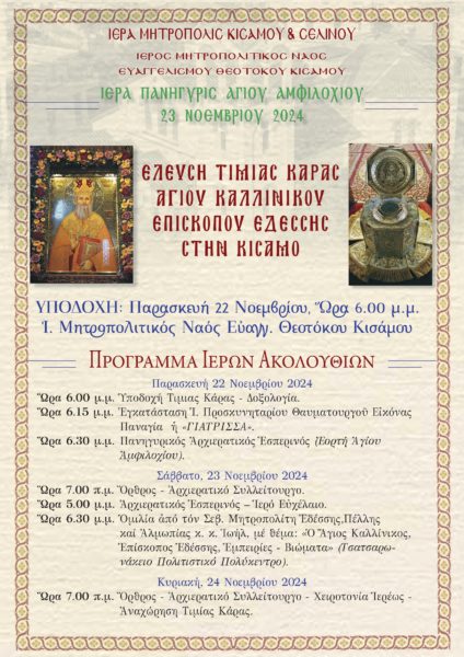 Η Τιμία Κάρα του Αγίου Καλλινίκου θα αναχωρήσει άμα το πέρας της Θείας Λειτουργίας της Κυριακής. Στις μεγάλες αυτές πνευματικές χαρές της Εκκλησίας μας, του ευλογημένου τριημέρου από 22 έως 24 Νοεμβρίου, καλείται ο λαός του Θεού όπως μετέχει. “Στους πνευματικά άνυδρους καιρούς μας χρεία έχουμε να τρέφουμε πνευματικά την ψυχή μας, λαμβάνοντας ευλογία και χάρι από τα δώρα του Ουρανού. Ελάτε να γευθούμε, να χαρούμε και να μοιραστούμε την χαρά της πνευματικής αυτής εμπειρίας”, αναφέρει η Ιερά Μητρόπολη Κισάμου.