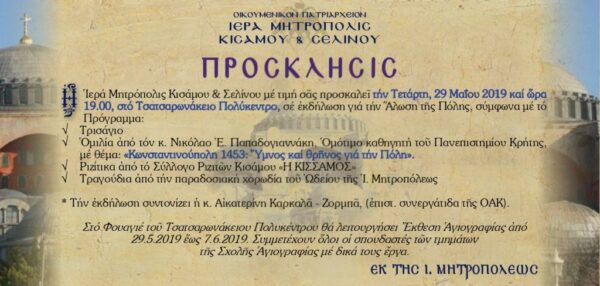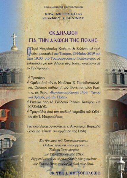 Η Ι. Μητρόπολις Κισάμου και Σελίνου, μάς προσκαλεί σε εκδήλωση μνήμης και τιμής για την Άλωση της Πόλης, η οποία θα πραγματοποιηθεί στους χώρους του Τσατσαρωνάκειου Πολύκεντρου την Τετάρτη, 29 Μαίου και ώρα 7.00μ.μ. Κεντρικός ομιλητής ο κ. Νικόλαος Ε. Παπαδογιαννάκης, ομότ. Καθηγητής του Πανεπιστημίου Κρήτης, ο οποίος θα μιλήσει με θέμα: