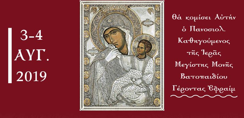 Την Εικόνα θα κομίσει ο Πανοσιολογιώτατος Καθηγούμενος της Μονής, Γέροντας Εφραίμ Βατοπαιδινός. Η επίσημος υποδοχή θα λάβει χώρα το Σάββατο, 3 Αυγούστου και ώρα 6.30μ.μ. εις την πλατεία “Μάνος Κατράκης” της Κισάμου και εν πομπή θα λιτανευτεί έως την Ι. Μονή Ζωοδόχου Πηγής Παρθενώνος, όπου περί ώρα 7.00μ.μ. θα ακολουθήσει Αρχιερατικός Εσπερινός, χοροστατούντος του Σεβ. Μητροπολίτου Νέας Κρήνης και Καλμαριάς κ. Ιουστίνου. Την Κυριακή, 4 Αυγούστου, εις την Ι. Μονή Παρθενώνος θα τελεστεί Θεία Λειτουργία ιερουργούντος του Καθηγουμένου της Ι. Μεγίστης Μονής Βατοπαιδίου, Γέροντος Εφραίμ. Καλείται ο ευσεβής και Θεοτοκόφιλος λαός του Θεού όπως μετέχει της υποδοχής της Ι. Εικόνος της Παναγίας Παραμυθίας ως και των Ι. Ακολουθιών και λάβει την ευχή και ευλογία της Μητέρας Παναγίας μας.