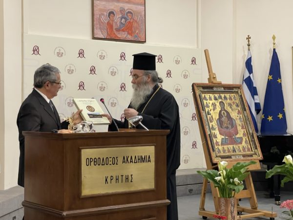 Ακολούθως στην Ορθόδοξο Ακαδημία Κρήτης, ο Γενικός Δντής Δρ. Κωνσταντίνος Ζορμπάς καλωσόρισε και συντόνισε την εόρτια εκδήλωση. Ο εκλεκτός ομιλητής Δρ. Εμμανουήλ Βαρβούνης, στην μεστή και εξαιρετική ομιλία του, αναφέρθηκε στους Αγίους Τρεις Ιεράρχες, στην διάσταση της σύνθεσης Ελληνισμού και Ορθοδοξίας στο επίπεδο της λαϊκής και της θρησκευτικής ζωής, στο ρόλο της οικογένειας ως βασικό κύτταρο της κοινωνίας, την κοινωνική ευθύνη, σημειώνοντας πως «Η ταυτότητα, η ιδιοπροσωπία του Γένους μας εδράζεται στην Ελληνορθόδοξη σύνθεση και αποτελεί το αληθινό συλλογικό μας ήθος», ευχαριστώντας «δια την τιμητική πρόσκληση».