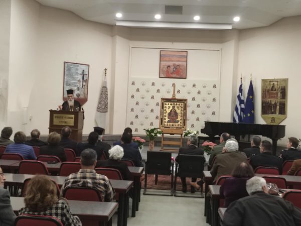 Ακολούθως στην Ορθόδοξο Ακαδημία Κρήτης, ο Γενικός Δντής Δρ. Κωνσταντίνος Ζορμπάς καλωσόρισε και συντόνισε την εόρτια εκδήλωση. Ο εκλεκτός ομιλητής Δρ. Εμμανουήλ Βαρβούνης, στην μεστή και εξαιρετική ομιλία του, αναφέρθηκε στους Αγίους Τρεις Ιεράρχες, στην διάσταση της σύνθεσης Ελληνισμού και Ορθοδοξίας στο επίπεδο της λαϊκής και της θρησκευτικής ζωής, στο ρόλο της οικογένειας ως βασικό κύτταρο της κοινωνίας, την κοινωνική ευθύνη, σημειώνοντας πως «Η ταυτότητα, η ιδιοπροσωπία του Γένους μας εδράζεται στην Ελληνορθόδοξη σύνθεση και αποτελεί το αληθινό συλλογικό μας ήθος», ευχαριστώντας «δια την τιμητική πρόσκληση».
