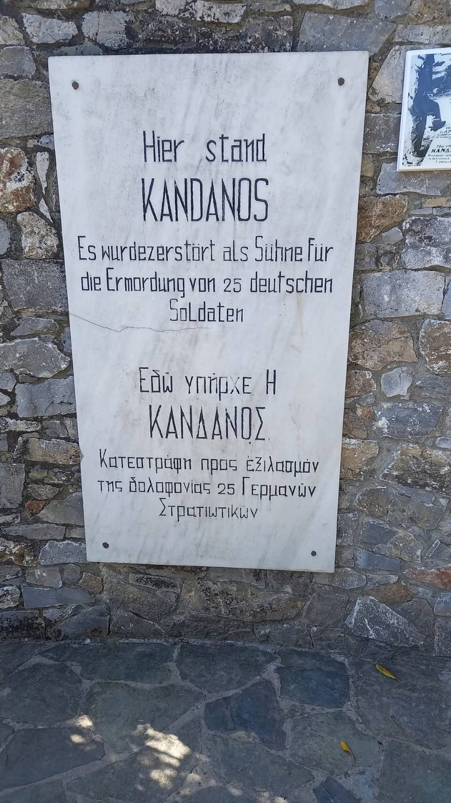 Στους χαιρετισμούς τους, τόσο ο Δήμαρχος Καντάνου-Σελίνου, κ. Αντώνιος Περράκης, όσο και ο Περιφερειάρχης Κρήτης κ. Σταύρος Αρναουτάκης, αναφέρθηκαν στο ζήτημα αυτό, σημειώνοντας ο Δήμαρχος Καντάνου-Σελίνου: «Να μην ξεχνάμε όχι μόνον τον πόλεμο, τις θηριωδίες, τα ολοκαυτώματα, αλλά και τις υποχρεώσεις της επιστροφής των Γερμανικών επανορθώσεων και του κατοχικού δανείου που παραμένουν ακόμα εκτός των δικαστικών αιθουσών του διεθνούς δικαστηρίου της Χάγης.».