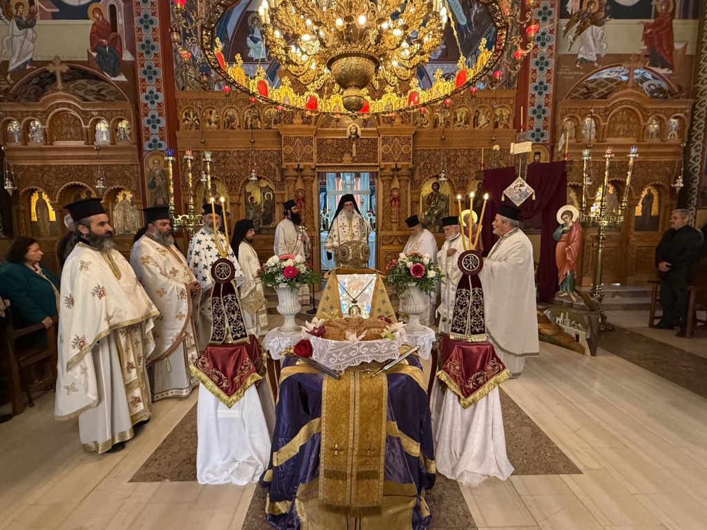 Στο τέλος της Θείας Λειτουργίας τελέστηκε Τρισάγιο επί του τάφου του αοιδίμου Ιεράρχου, ο οποίος ευρίσκεται στον προαύλιο χώρο του Ιερού Μητροπολιτικού Ναού, και ακολούθησε πλούσια φιλοξενία στους ανακαινισμένους χώρους του παρακείμενου Ενοριακού πνευματικού κέντρου.