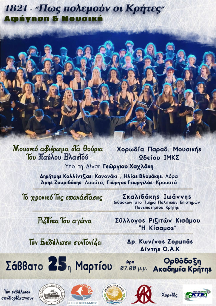 Η εκδήλωση θα διανθιστεί από την χορωδία της Παραδοσιακής Μουσικής του Ωδείου Ιεράς Μητρόπολης Κισάμου και Σελίνου, η οποία θα παρουσιάσει Θούρια από τη συλλογή του Παύλου Βλαστού, σπουδαίου Ιεροψάλτη και Λαογράφου. Την Χορωδία συνοδεύει τετραμελής ορχήστρα υπό την Δ/νση του χοράρχη κ. Γεώργιου Χαχλάκη, ενώ εκτός του Μουσικού μέρους θα υπάρξει και σχετική Αφήγηση για το έργο.