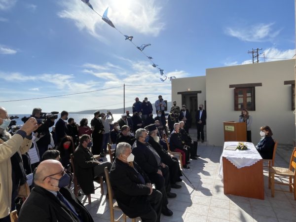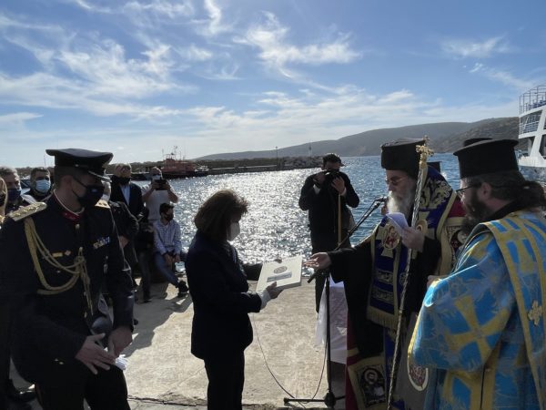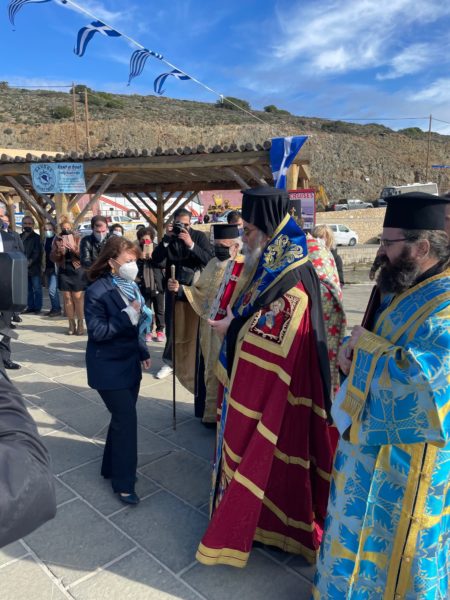Μετά την Ακολουθία του Αγιασμού, ο Ποιμενάρχης κ. Αμφιλόχιος προσφώνησε την εξοχ. κα Πρόεδρο ως ακολούθως: «Με βαθύτατη χαρά και συγκίνηση και υπό την ιδιότητα του Επισκόπου της ακριτικής ετούτης νήσου, επιτρέψατε μοι όπως σας καλωσορίσω εις το ακρότατο σημείο της Ευρωπαϊκής ηπείρου, το νοτιότερο σημείο της Ελλάδας και της Ευρώπης· την όμορφη και ξακουστή νήσο Γαύδο, η οποία στολίζει το μέσον του Λιβυκού πελάγους· κατοικημένη από την Νεολιθική εποχή, με πλούσια προϊστορία και ιστορία. Φθάσατε σήμερα, επί πτερύγων ανέμων και διαπλέουσα το πέλαγος, ανήμερα των Θεοφανείων, όπου ανοίγουν οι Ουρανοί και αγιάζονται τα ύδατα, η κτίσις και ο άνθρωπος. Φθάσατε εις την ιερά και ιστορική ετούτη νήσο, η οποία προ 2000 και πλέον χιλιάδων χρόνων, δέχθηκε ως ναυαγό τον Απόστολο Παύλο, όταν στο τελευταίο του ταξίδι για την Ρώμη, ως αναφέρουν οι Πράξεις των Αποστόλων: “ὑποπνεύσαντος δέ νότου δόξαντες τῆς προθέσεως κεκρατηκέναι, ἄραντες ἄσσον παρελέγοντο τήν Κρήτην. Μετ’ οὐ πολύ δέ ἔβαλε κατ’ αὐτῆς ἄνεμος τυφωνικός ὁ καλούμενος Εύροκλύδων. Συναρπασθέντος δέ τοῦ πλοίου καί μή δυναμένου ἀντοφθαλμεῖν τῷ ἀνέμῳ ἐπιδόντες ἐφερόμεθα. Νησίον τι ὑποδραμόντες καλούμενον Κλαύδην – ἔτσι ονομαζόταν κατά τούς χρόνους ἐκείνους ἡ ἀγαπημένη μας νῆσος – μόλις ἰσχύσαμεν περικρατεῖς γενέσθαι τῆς σκάφης” (Πράξ. 27,13-16). Φθάσατε εις την νήσο η οποία, τον Ιούνιο του 2002, είχε την μεγάλη ευλογία και χαρά όπως υποδεθχεί, δια πρώτη φορά εις την ιστορία της, Οικουμενικό Πατριάρχη, τον Παναγιώτατο Οικουμενικό ημών Πατριάρχη κ.κ. Βαρθολομαίο, ο Οποίος ως άλλος Απόστολος των Εθνών, ηθέλησε έμπρακτα και πλουσιόδωρα να ευλογήσει με την Πατριαρχική παρουσία Του και την μεγαλειώδη Πατρική μέριμνα και αγάπη Του τους ηρωικούς αυτούς ακρίτες, τους ολίγους μεν, αλλά μεγάλους εις την ψυχή καί τό πνεύμα, καθώς ως είχε σημειώσει εις την ομιλία Του: «Ἡ ἡμετέρα παρουσία ἔχει τόν χαρακτῆρα τῆς ὑπομνήσεως, ὅτι εἰς τήν καρδίαν ἡμῶν εἶσθε ἐγγεγραμμένοι καί ὑμεῖς οἱ ὀλίγοι μέν ἀριθμητικῶς οἱ φυλάσσοντες ὅμως ἀμετακινήτως τήν πατρογονικήν γῆν, σεβόμενοι τήν αἰωνόβιον ἱστορίαν καί τόν ὑπέροχον ἀπό πλευρᾶς οἰκολογίας τόπον τοῦτον». Φθάσατε λοιπόν σήμερα και εσείς δια να γράψετε την δική σας ιστορία, δια να τιμήσετε και να τιμηθείτε, καθώς η συμβολική και ευγενής αυτή κάθοδος σας εις την εσχατιά αυτή του λιβυκού πελάγους, η έξοδος σας από το κλεινόν άστυ και η είσοδος σας εις τις καρδιές πάντων ημών και κυρίως των ακριτών κατοίκων της Γαύδου, δεν καταγράφεται μόνο εις την ιστορία του τόπου και της Πατρίδας μας, αλλά φανερώνει το έμπρακτο ενδιαφέρον, την αγωνία σας και την ευαισθησία σας δια την ακριτική ετούτη νήσο και τους κατοίκους της, οι οποίοι, γενναιόψυχοι ακρίτες νησιώτες, εν μέσω πολλών δυσκολιών και αντιξοοτήτων, παραμένουν σταθεροί, ακμαίοι και αμετακίνητοι στις πατρογονικές τους εστίες, την γη των πατέρων τους, σεβόμενοι την αιωνόβιο ιστορία και τον υπέροχο από πλευράς οικολογίας τούτο τόπο, φυλάττοντας Θερμοπύλες. Ανάμεσα τους και ο Εφημέριος της Γαύδου, Αιδ. π. Εμμανουήλ Μπικογιαννάκης, γέννημα και θρέμμα του νησιού, ο οποίος επί 5 ολόκληρες δεκαετίες διακονεί τον τόπο και τους ανθρώπους του και όπως ο ίδιος δηλώνει: «Μπορεί ο τόπος μας να είναι φτωχός, αλλά για εμάς είναι ο καλύτερος».