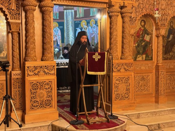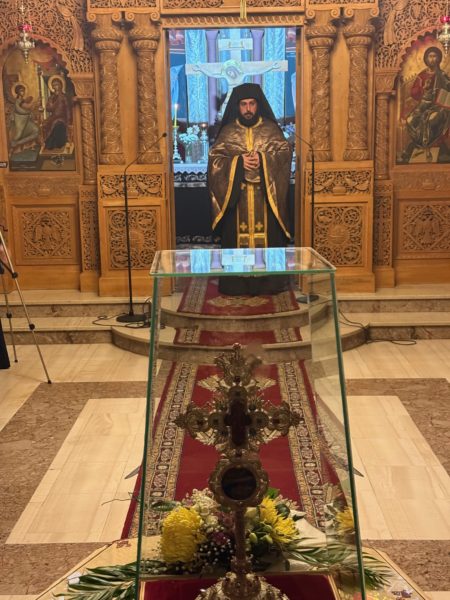 Τον Τίμιο Σταυρό κόμισε, εκ προσώπου του Καθηγουμένου, Παν. Αρχιμανδρίτου π. Μακαρίου (Σπυριδάκη), ο αδελφός της Μονής, π. Αιμιλιανός , λόγω εκτάκτου κωλύματος του Καθηγουμένου π. Μακαρίου, ο οποίος είχε κληθεί και ως ομιλητής, την ομιλία του οποίου μετέφερε ο αδελφός της Μονής, με θέμα: «Η αντιμετώπιση της άρσης του Σταυρού στην καθημερινή ζωή του Χριστιανού».