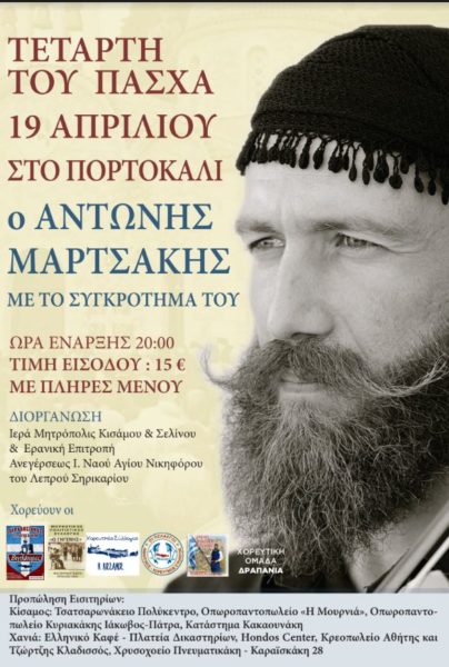 Η Ιερά Μητρόπολις Κισάμου και Σελίνου και η Ερανική Επιτροπή Ανεγέρσεως του Ιερού Προσκυνήματος του Οσίου Νικηφόρου του Λεπρού διοργανώνουν την Τετάρτη του Πάσχα, 19 Απριλίου και ώρα 20.00μ.μ. στο Κέντρο «ΠΟΡΤΟΚΑΛΙ», μεγάλη παραδοσιακή, Κρητική βραδιά με τον καταξιωμένο Καλλιτέχνη, μεγάλο τροβαδούρο της Κρητικής Μουσικής, Αντώνη Μαρτσακη και το συγκρότημα του.