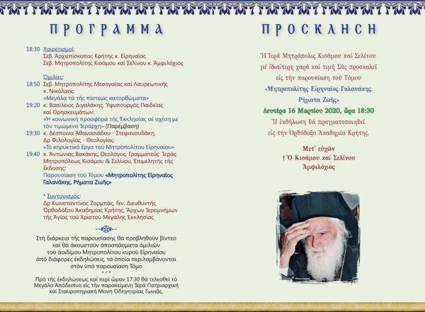 Η Ιερά Μητρόπολη Κισάμου και Σελίνου, μάς προσκαλεί στην ΠΑΡΟΥΣΙΑΣΗ ΤΟΜΟΥ «Μητροπολίτης Εἰρηναῖος Γαλανάκης. Ρήματα Ζωῆς», κατά τη Δευτέρα 16 Μαρτίου 2020 και ώρα 18:30 στην Ορθόδοξο Ακαδημία Κρήτης. Χαιρετίζει ο Σεβ. Αρχιεπίσκοπος Κρήτης, κ. Ειρηναίος.