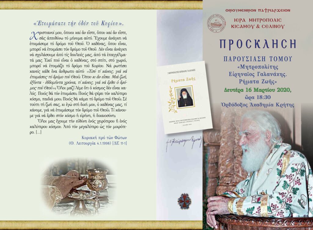 Η Ιερά Μητρόπολη Κισάμου και Σελίνου, μάς προσκαλεί στην ΠΑΡΟΥΣΙΑΣΗ ΤΟΜΟΥ «Μητροπολίτης Εἰρηναῖος Γαλανάκης. Ρήματα Ζωῆς», κατά τη Δευτέρα 16 Μαρτίου 2020 και ώρα 18:30 στην Ορθόδοξο Ακαδημία Κρήτης. Χαιρετίζει ο Σεβ. Αρχιεπίσκοπος Κρήτης, κ. Ειρηναίος.
