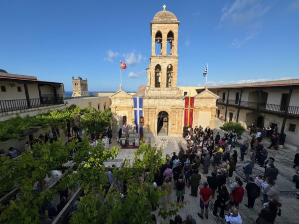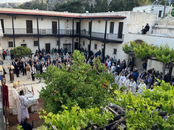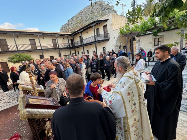 Ο προαύλιος χώρος της Μονής, όπου τελέστηκε και ο Εσπερινός της Αγάπης, κατακλύστηκε από πλήθος προσκυνητών, τόσο εκ της ευρύτερης περιοχής, όσο και αλλαχού, εκ Ρεθύμνου, Ηρακλείου, ως και αρκετοί επισκέπτες των ημερών, μεταξύ των οποίων και ομάδα συνέδρων εκ Γερμανίας, από την Ορθόδοξο Ακαδημία Κρήτης. Το Ευαγγέλιο της ημέρας αναγνώσθηκε από μετέχοντες Ιερείς σε διάφορες γλώσσες (Λατινικά, Αγγλικά, Ιταλικά, Ισπανικά, Ρουμανικά, Σερβικά, Νεοελληνικά). Ακολούθως αναγνώσθηκε η Πατριαρχική Απόδειξις επι τω Αγίω Πάσχα και εψάλη η φήμη του Παναγιωτάτου Οικουμενικού Πατριάρχου κ.κ. Βαρθολομαίου.
