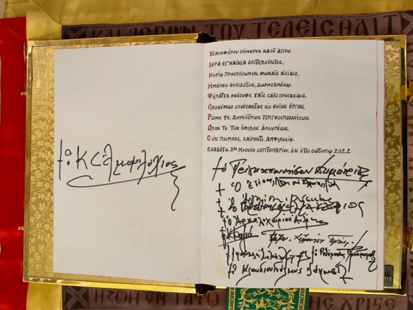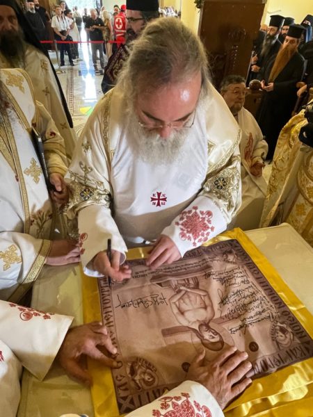Ο προεξάρχων των ιερών Εγκαινίων, Μητροπολίτης Γέρων Πριγκηποννήσων κ.κ. Δημήτριος, ως και άπαντες οι συλλειτουργούντες Αρχιερείς υπέγραψαν εις το ιστορικό, πλέον, Ιερό Ευαγγέλιο των Εγκαινίων ως και ένα ειλητό, το οποίο και θα παραμείνει εις το προσκύνημα του Οσίου Νικηφόρου, βεβαιωτικό του μεγάλου αυτού πνευματικού και ιστορικού γεγονότος.