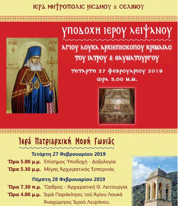 Μία μεγάλη ευλογία θα βιώσουν σε λίγες ημέρες οι πιστοί στη Δυτική Κρήτη αφού θα υποδεχθούν τα λείψανα του Αγίου Λουκά του Ιατρού, Αρχιεπισκόπου Συμφερουπόλεως και Κριμαίας. Αναλυτικότερα και με βάση την ανακοίνωση της τοπικής Μητρόπολης Κισάμου και Σελίνου αναφέρεται: Εκ της Ιεράς Μητροπόλεως μας ανακοινώνεται η ευλογητική έλευσις του Ιερού Λειψάνου του Αγίου Λουκά Αρχιεπισκόπου Κριμαίας, μετά τμήματος εκ της καρδίας του Αγίου Λουκά. Τα ιερά Λείψανα, τα οποία θα εναποτεθούν προς προσκύνηση εις την Ιερά Πατριαρχική Μονή Γωνιάς, Κολυμβάρι, θα κομίσει προς ευλογία και αγιασμό ο Σεβ. Μητροπολίτης Αργολίδος κ. Νεκτάριος, σύμφωνα με το ακόλουθο Πρόγραμμα: Τετάρτη 27 Φεβρουαρίου: Ώρα 5.00μ.μ. Επίσημος Υποδοχή-Δοξολογία. Ώρα: 5.30μ.μ. Αρχιερατικός Εσπερινός, χοροστατούντος του Σεβ. Μητροπολίτου Αργολίδος κ. Νεκταρίου. Ώρα 7.00μ.μ., παρουσίασις βιβλίου «Η ασκητική της αγάπης, Γερόντισσα Γαβριηλία», εις την παρακείμενη Ορθόδοξο Ακαδημία Κρήτης, με ομιλητή τον Σεβ. Μητροπολίτη Αργολίδος κ. Νεκτάριο και άλλους εκλεκτούς ομιλητές. Πέμπτη 28 Φεβρουαρίου: Ώρα 7.30π.μ. Όρθρος-Αρχιερατική Θεία Λειτουργία, ιερουργούντος του Σεβ. Μητροπολίτου Αργολίδος κ. Νεκταρίου. Ώρα 4.00μ.μ. Ιερά Παράκλησις του Αγίου Λουκά Αρχιεπισκόπου Κριμαίας. Αναχώρησις Ιερών Λειψάνων. Προσκαλείται ο ευσεβής και φιλάγιος λαός του Θεού προς ευλογία και αγιασμό.