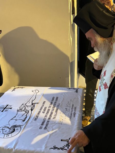 Επιπροσθέτως, ευχαρίστησε τον κ. Ιάκωβο Χονδράκη «..πολύτιμο αρωγό και συνοδοιπόρο στο ταπεινό μας έργο, πάντα παρών και πρόθυμος», ως είπε, δια τις πολλές του διευκολύνσεις του διημέρου (καρέκλες, 3000 κρύα νερά, επαγγελματικούς ανεμιστήρες, κ.α.), προσφέροντας προς όλους αγιογραφημένη, με φυσικά χρώματα, παράσταση του Τιμίου Προδρόμου, πάνω σε μεγάλο βότσαλο. Ευχαρίστησε, ονομαστικά, και όλους τους εμπλεκομένους ως και όσους εργάστηκαν στο έργο. Ευχαριστιακά αναφέρθηκε στον Πρωτοσύγκελλο της Ιεράς Μητροπόλεως Παν. Αρχ. π. Αγαθάγγελο Κουμαρτζάκη «ο οποίος πολύ έχει κοπιάσει και πολύ χρόνο διέθεσε τον μήνα αυτό για τον συντονισμό, την οργάνωση, ως και άλλα πολλά, συμβάλλοντας ουσιαστικά και αποτελεσματικά», ως και στον Παν. Αρχ. π.Χρύσανθο Τσαχάκη, υπεύθυνο της λαχειοφόρου κληρώσεως που ακολούθησε, επίσης σε όλους τους Κληρικούς της Ι. Μητροπόλεως, τους χορηγούς των πλούσιων δώρων και τους πολλούς εθελοντές. Της επομένης των Θυρανοιξίων τελέστηκε Αρχιερατική Θεία Λειτουργία και Ιερά Παράκληση του Τιμίου Σταυρού, προ της αναχωρήσεως Του.