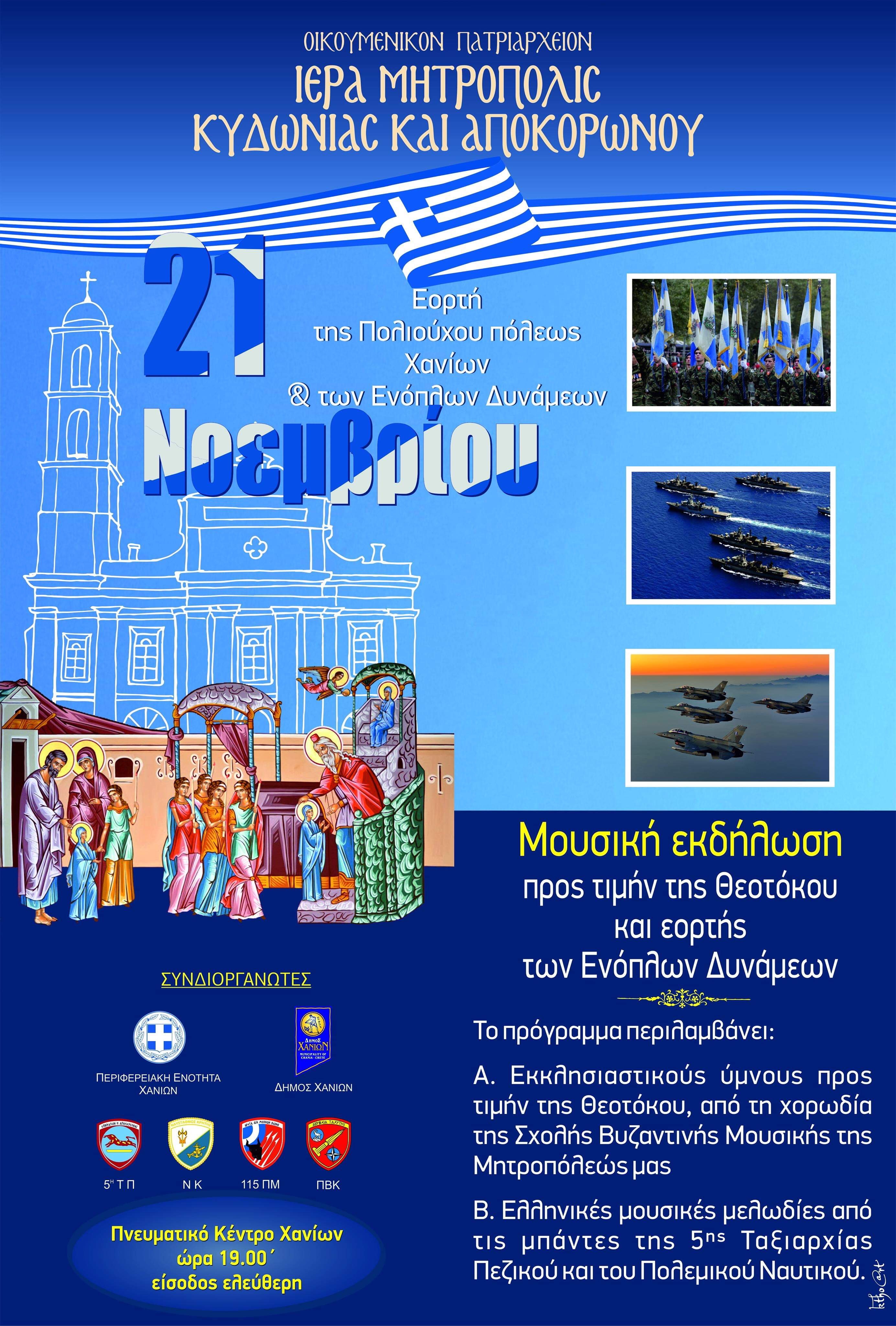 Ὁμοίως, τήν Τετάρτην 21 Νοεμβρίου τό ἀπόγευμα καί ἀπό ὥραν 7:00 μ.μ. θά πραγματοποιηθῇ μουσική ἐκδήλωσις πρός τιμήν τῆς Θεοτόκου καί τῶν Ἐνόπλων Δυνάμεων τῆς Πατρίδος μας εἰς τό Πνευματικόν Κέντρον Χανίων, τῇ συνεργασίᾳ τῆς Ἱερᾶς Μητροπόλεως Κυδωνίας καί Ἀποκορώνου, τῶν Ἐνόπλων Δυνάμεων, τῆς Περιφερειακῆς Ἑνότητος Χανίων καί τοῦ Δήμου Χανίων.