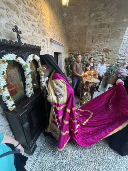 Ανήμερα της εορτής, τελέσθηκε η Ακολουθία του Όρθρου, χοροστατούντος του Σεβασμιωτάτου Αρχιεπισκόπου Κρήτης κ. Ευγενίου και στη συνέχεια Αρχιερατικό Συλλείτουργο, προεξάρχοντος του Σεβασμιωτάτου Αρχιεπισκόπου κ. Ευγενίου και συνιερουργούντων του Σεβασμιωτάτου Μητροπολίτου κ. Δαμασκηνού και του Σεβασμιωτάτου Μητροπολίτου Ιεραπύτνης και Σητείας κ. Κυρίλλου, ενώ κατά αρχαία παράδοση ο Ηγούμενος της Μονής Παν/τος Αρχιμανδρίτης Αμβρόσιος Σκαρβέλης παρέστη από το Παραθρόνιο και στο τέλος της ακολουθίας διένειμε το αντίδωρο.