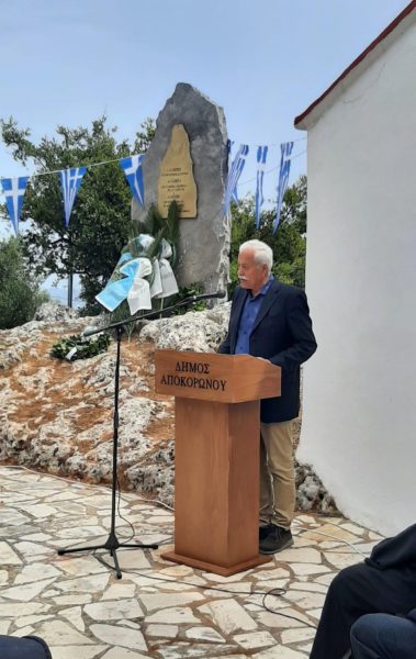 Ακολούθησε Κατάθεση στεφάνων, ανάκρουση του Εθνικού Ύμνου, Χαιρετισμός από τον Δήμαρχο Αποκορώνου κ. Χαράλαμπο Κουκιανάκη, Χαιρετισμός από τον Σύμβουλο του Περιφερειάρχη Κρήτης, κ. Δημήτρη Μιχελογιάννη και Ομιλία με τίτλο «Το Ολοκαύτωμα του Σαμώνα» από τον αρχιτέκτονα μηχανικό και ιστορικό ερευνητή κ. Μιχάλη Κατσανεβάκη.