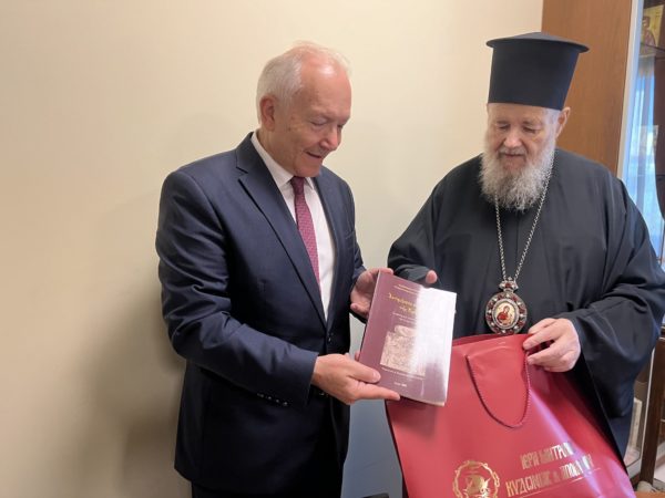Ως ενθύμιο της επισκέψεώς του, ο Μητροπολίτης του προσέφερε μία εικόνα των Αγίων της Μητροπόλεως μας καθώς και εκδόσεις, με τις ευχές να είναι αρωγοί στο έργο του επ’ αγαθώ της πατρίδος και των νησιών.