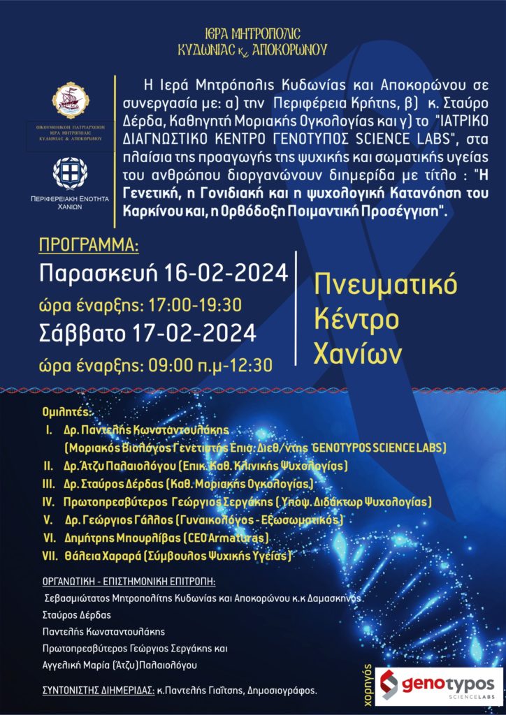 Η Ιερά Μητρόπολη Κυδωνίας και Αποκορώνου, σε συνεργασία με την Περιφέρεια Κρήτης, τον κ. Σταύρο Δέρδα, Καθηγητή Μοριακής Ογκολογίας και το “ΙΑΤΡΙΚΟ ΔΙΑΓΝΩΣΤΙΚΟ ΚΕΝΤΡΟ ΓΕΝΟΤΥΠΟΣ SCIENCE LABS”, στα πλαίσια της προαγωγής της ψυχικής και σωματικής υγείας του ανθρώπου, διοργανώνουν διημερίδα με τίτλο: “Η Γενετική, η Γονιδιακή και η ψυχολογική Κατανόηση του Καρκίνου και, η Ορθόδοξη Ποιμαντική Προσέγγιση”.