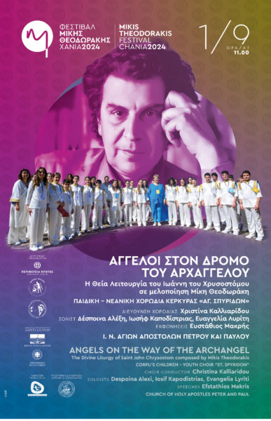 Στα πλαίσια της διοργάνωσης “Φεστιβάλ Μίκης Θεοδωράκης” που θα λάβει χώρα στα Χανιά από τις 30 Αυγούστου μέχρι τις 2 Σεπτεμβρίου, η κερκυραϊκή χορωδία “Άγιος Σπυρίδων” θα παρουσιάσει, την Κυριακή 1 Σεπτεμβρίου 2024, τη Θεία Λειτουργία του Αγ. Ιωάννη του Χρυσοστόμου σε μελοποίηση του Μίκη Θεοδωράκη, στον Ιερό Ναό των Αγίων Αποστόλων Πέτρου και Παύλου στις 11:00 μ.μ.