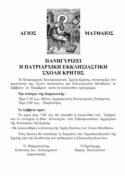Η Πατριαρχική Εκκλησιαστική Σχολή Κρήτης πανηγυρίζει τον Προστάτην της, Άγιον Απόστολον και Ευαγγελιστήν Ματθαίον, κατά το Σάββατο 16 Νοεμβρίου 2019, συμφώνως με το κάτωθι επισυναφθέν Πρόγραμμα: