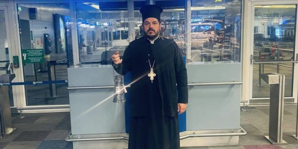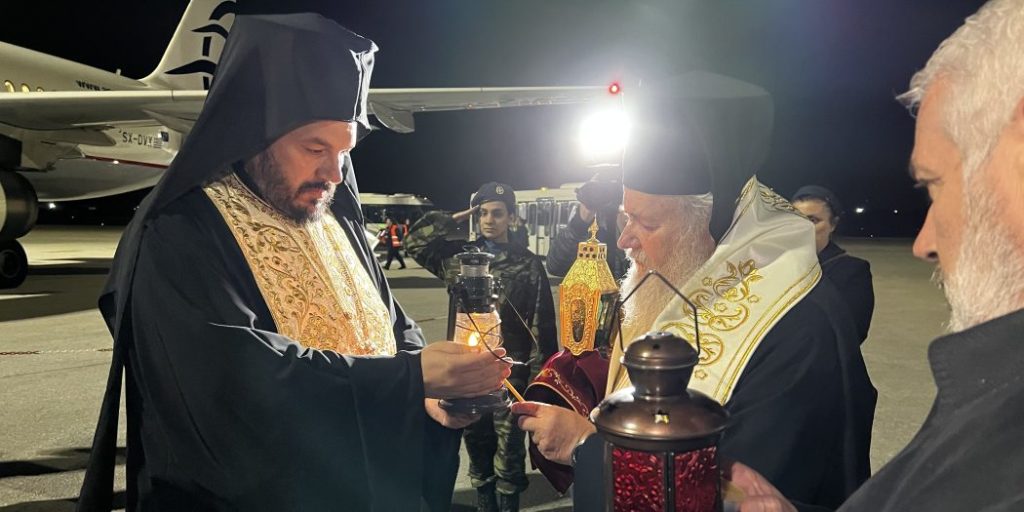 Ο Πρωτοσύγκελλος της Μητροπόλεως είχε μεταβεί νωρίτερα στο αεροδρόμιο “Ελευθέριος Βενιζέλος” για να παραλάβει το Άγιο Φως.