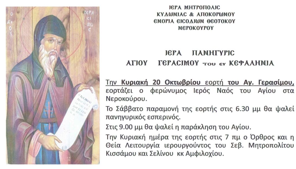 Την Κυριακή 20 Οκτωβρίου 2019, εορτή του Αγίου Γερασίμου, πανηγυρίζει ο φερώνυμος Ιερός Ναός του Αγίου στα Νεροκούρου της Ιεράς Μητροπόλεως Κυδωνίας και Αποκορώνου, συμφώνως με το ως άνω επισυναφθέν Πρόγραμμα Πανηγύρεως.