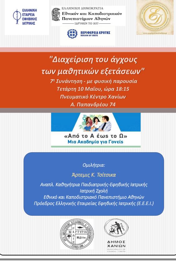 Η Περιφέρεια Κρήτης – Περιφερειακή Ενότητα Χανίων σε συνδιοργάνωση με τη Δομή Επαγρύπνηση στο Διαδίκτυο, της Ιεράς Μητροπόλεως Κυδωνίας και Αποκορώνου και το Δήμο Χανίων συμμετέχουν ως Τοπικοί Διοργανωτές στο Πανελλήνιο Πρόγραμμα: Από το «Α έως το Ω» Μια Ακαδημία για Γονείς (8ος κύκλος), 7η Συνάντηση, που πραγματοποιείται από το ΠΜΣ Στρατηγικές Αναπτυξιακής και Εφηβικής Υγείας, της Ιατρικής Σχολής του Εθνικού και Καποδιστριακού Πανεπιστημίου Αθηνών και την Ελληνική Εταιρεία Εφηβικής Ιατρικής (Ε.Ε.Ε.Ι.).