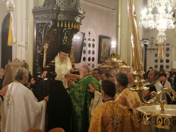 Του πανηγυρικού Αρχιερατικού Εσπερινού προεξήρχε ο Σεβασμιώτατος Μητροπολίτης Κυδωνίας και Αποκορώνου κ. Δαμασκηνός, πλαισιούμενος από τον Γενικό Αρχιερατικό Επίτροπο της Μητρόπολης Πρωτ. του Οικουμενικού Θρόνου Γεώργιο Περάκη, τον Προϊστάμενο του Ιερού Ναού και Αρχ. Επίτροπο της Ά Αρχιερ. Περιφέρειας Πρωτ. Δημήτριο Λαμπαθάκη και του συνεφημερίου του Ιερού Ναού και τεχνικού Διευθυντή του Ραδιοφωνικού Σταθμού Μαρτυρία Πρωτ. Κων/νου Θωμαδάκη, του Αρχ. Επιτρόπου της Ε Αρχιερ. Περιφέρειας Πρωτ. Εμμανουήλ Χατζηδάκη, του Αρχ. Επιτρόπου της ΣΤ Αρχ. Περιφέρειας Πρωτ. Γεωργίου Πετράκη, καθώς και πλήθους Κληρικών της Μητρόπολης.
