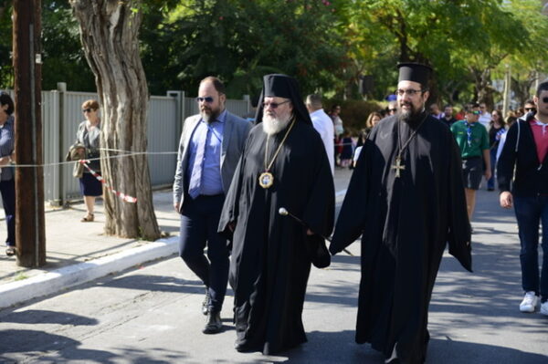 Στη συνέχεια, ο Σεβασμιώτατος Ποιμενάρχης κ.κ. Δαμασκηνός, συνοδευόμενος από τον Πανοσιολογιώτατο Πρωτοσύγκελλο Αρχιμ. Δαμασκηνό Λιονάκη κατευθύνθηκε στην εξέδρα των επισήμων για να παρακολουθήσει και να ευλογήσει την μαθητική και στρατιωτική παρέλαση.