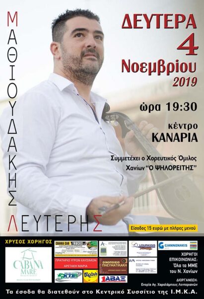 Η Ιερά Μητρόπολη Κυδωνίας και Αποκορώνου σας προσκαλεί στην ετήσια χοροεσπερίδα που διοργανώνει η Ενορία Αγίου Χαραλάμπους Λενταριανών, την Δευτέρα 4 Νοεμβρίου στις 7:30 μ.μ., στο κέντρο ΚΑΝΑΡΙΑ στον Κουμπέ με τον Λευτέρη Μαθιουδάκη και το συγκρότημά του.