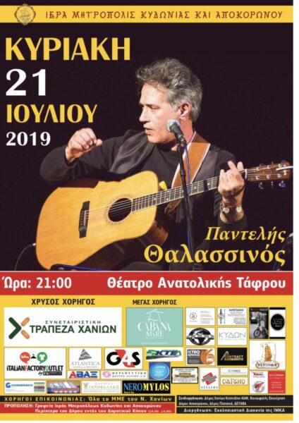 Η Ιερά Μητρόπολη Κυδωνίας και Αποκορώνου και ο Παντελής Θαλασσινός, σας καλούν στο Θέατρο της Ανατολικής Τάφρου σε ένα μουσικό ταξίδι με σκοπό την ενίσχυση του φιλανθρωπικού της έργου.